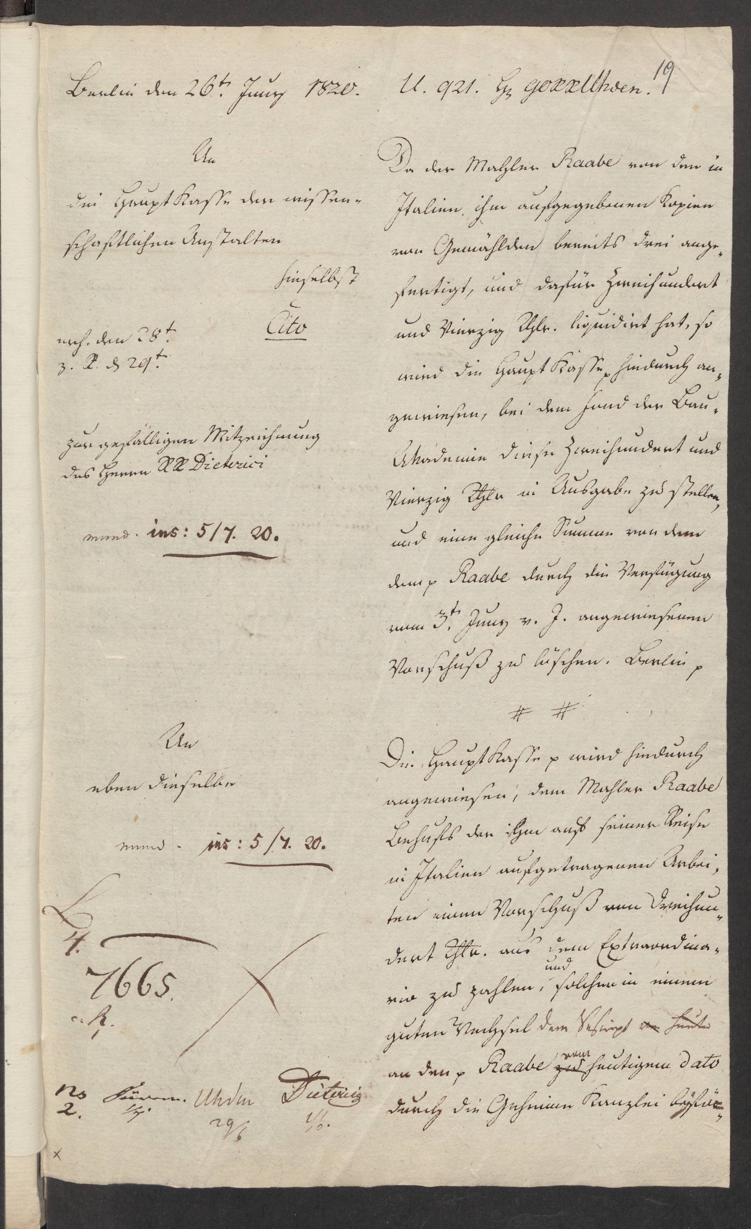26. Juni 1820. Kultusministerium an Hauptkasse (Konzept).