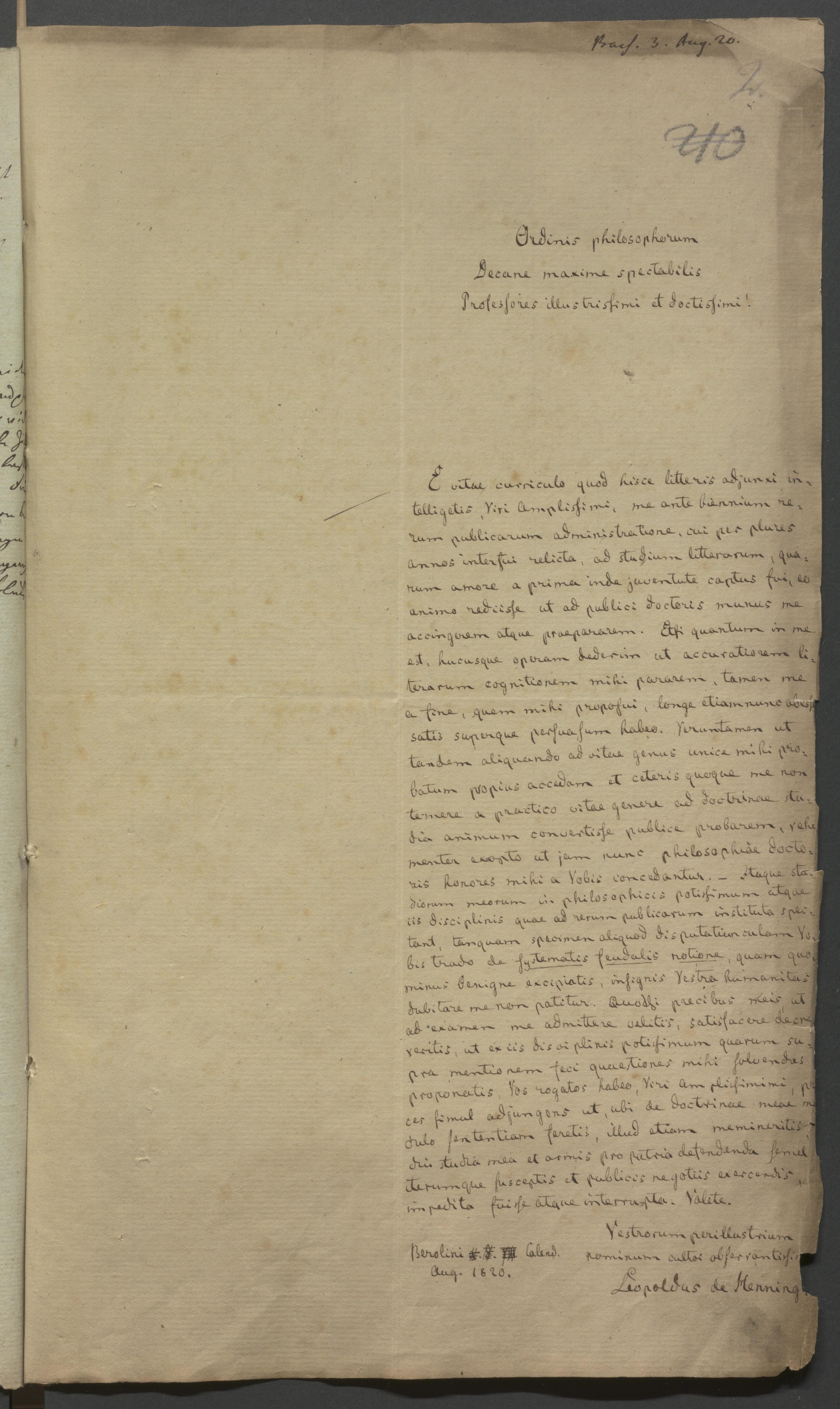 1. August 1820. von Henning an Philosophische Fakultät.