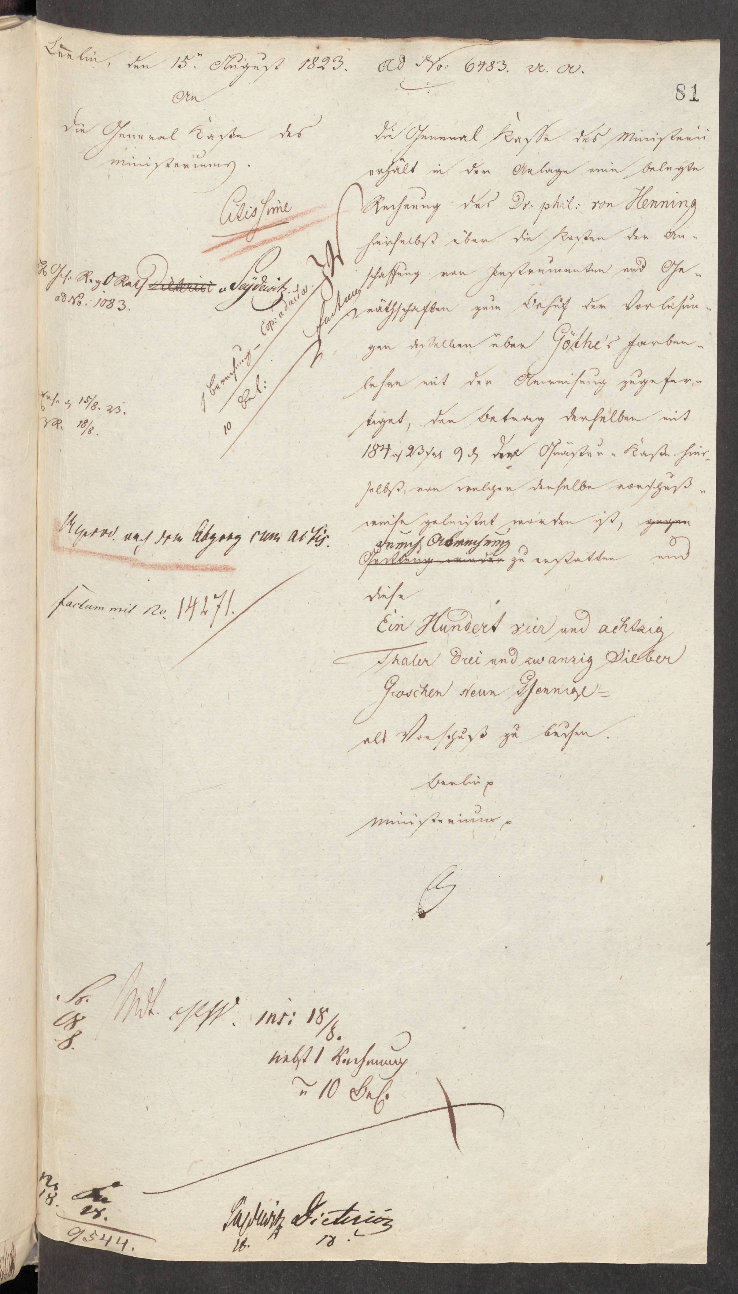 15. August 1823. Kultusministerium an Generalkasse (b) (Konzept).